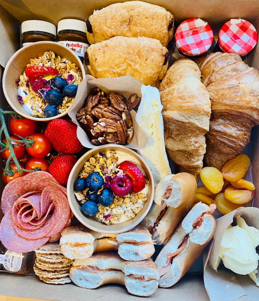Our brunch boxes for 2 typically include 2 croissants, 2 pan au chocolate, 2 scotch pancakes, jam, chocolate spread, butter, honey, a salami rose, waffles, a smoked salmon & cream cheese bagel, brie, nuts, fresh fruits & Cornish yoghurt topped with granola & fresh berries fresh orange juice.