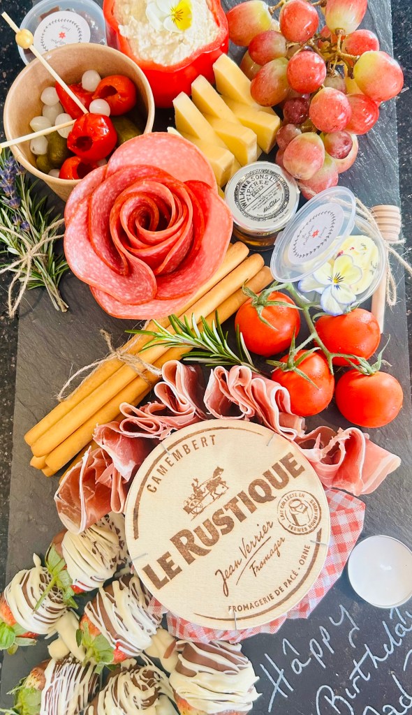 Our celebration slates are fabulous and perfect for sharing with your love one or your best friend as a treat. They make great presents for birthdays & anniversaries & guess what, you get to keep the slate! Contact us if you want a refill and get it at our discounted price of £35. The slates include a baking or regular camembert, manchego cheese, salami rose, prosciutto, honey, fresh fruits, chocolate dipped strawberries, anti-pasti, humous, chilli jam, pickles, olives, crackers, breadsticks & fresh bread. You decide what message to have written on your slate which also includes a tealight.