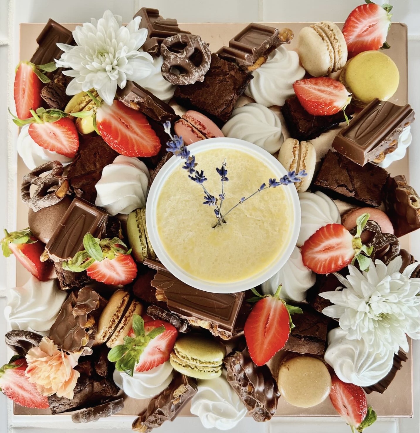 Our delicious dessert board typically contains 12 of our own homemade very chocolatey brownies, 12 meringue kisses, fresh berries, 12 chunks of chunky salted pretzel chocolate, macarons, at least 12 chocolate pretzels & a 227g tub of Rodda’s Cornish Clotted cream & of course some pretty petals, yum!